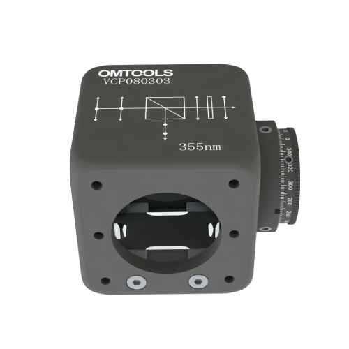 OMTOOLS可调圆偏振分束器由偏振分束立方与四分之一波片组成,分束立方外壳顶部有入射反射透射方向标识,波片外壳有快轴方向。使用时光束从分束立方入射、波片出射,波片可360°自由旋转,以将入射光的P偏振光分量改变为线偏振光、椭圆偏振光(左旋、右旋)以及圆偏振光(左旋、右旋)。将快轴方向与p光偏振方向呈45°夹角时,出射光为右旋圆偏光(沿光轴方向看去)。