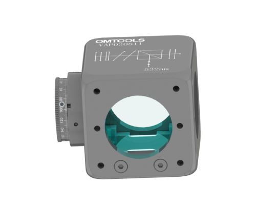 OMTOOLS宽带可调激光线偏振分束器由消色差空气隙零级二分之一波片与宽带偏振分束立方组成,分束立方外壳顶部有入射反射透射方向标识,波片外壳有快轴方向。使用时线偏振光束从波片入射、分束立方出射,波片可360°自由旋转,使透射光与反射光光强按不同比例连续变化。